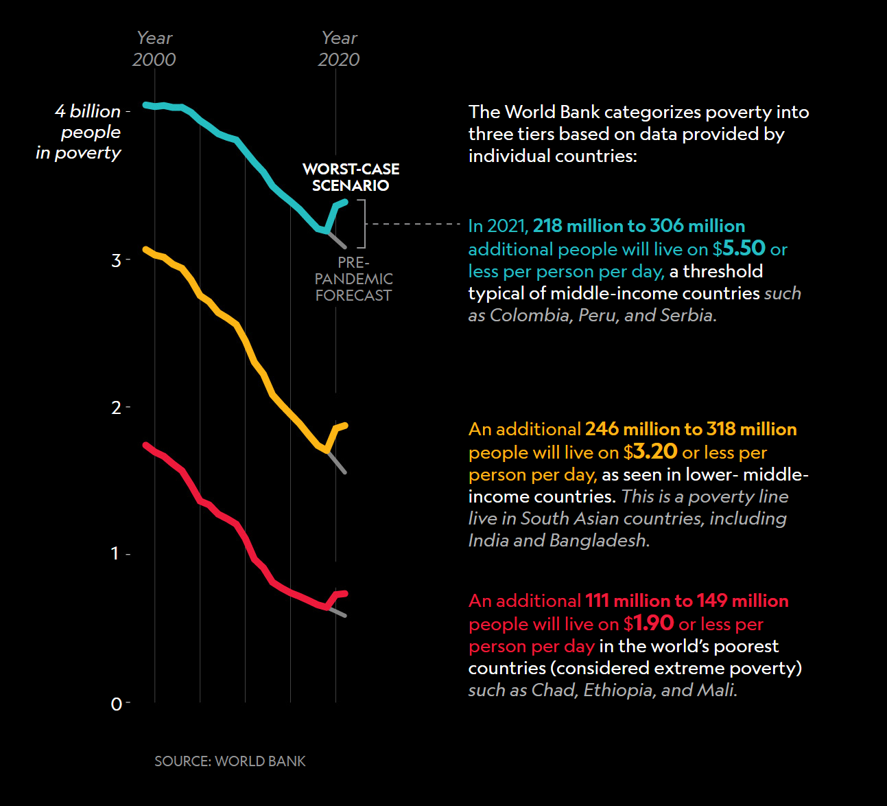 According to the visual prediction in October 2020, by the end of the year, approximately 100 million more people were expected to live in extreme poverty (less than $1.90 a day), with millions more falling into less extreme poverty. The projection is already grim, and continued lockdowns could worsen the situation in 2021.