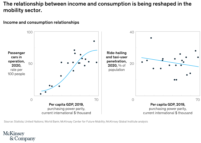 Ride-hailing services are reshaping the mobility sector in Asia. Traditionally, car ownership follows an S-curve based on income, after which crossing an inflexion point, suddenly everyone buys cars. Otherwise, everyone is going carless. This phenomenon is clearest in Singapore, where the price of a second-hand Toyota is $60,000.